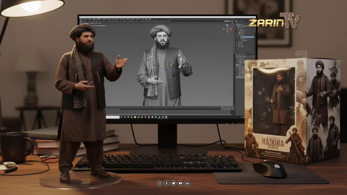Next to the computer screen is a toy packaging box, designed in a style reminiscent of high-quality collectible figures, printed with original artwork. The packaging features two-dimensional flat illustrations.”